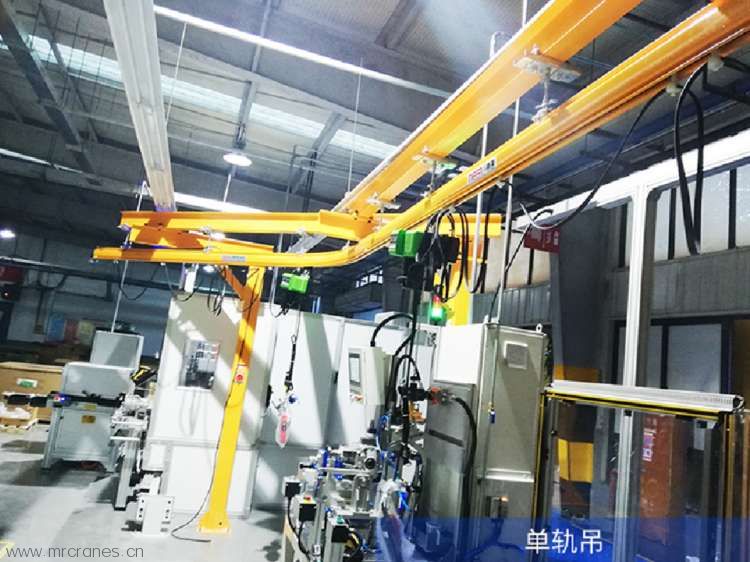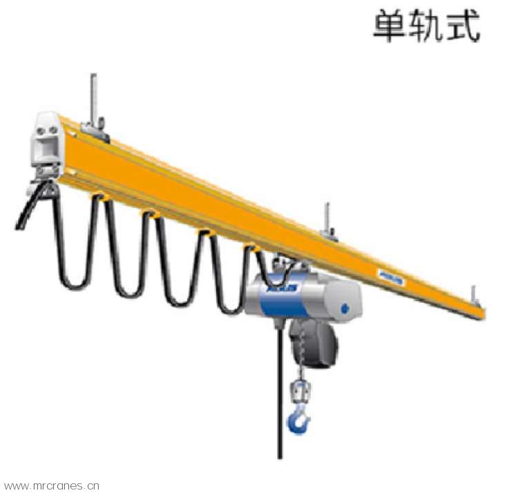 冷轧型钢轨道,自重轻,刚性好,表面光滑,整根焊接时,由电脑程序控制一次完成,型轨平直度小于0.75mm/m和型轨扭曲度小于0.1度/m;轨道内的特殊导向面和稍微倾斜的接触面保证了小车行走的平稳性。在中级额定起重量范围内,采用内运行设计以保护小车和内部 (封闭式)滑触线。表面静电喷涂处理,刚性材质能保证正常使用情况下永久不变形。实现从定点搬运到高准确度的多点、多节拍的自动化输送,都能随意组合而成
