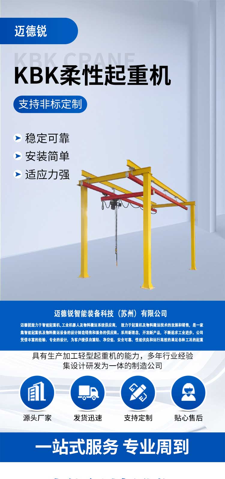 非常感谢您的到来!迈德锐智能装备科技(苏州)有限公司M&RCRANES,位于江苏苏州,是一家轻型起重运输系统解决方案供应商。迈德锐以智能化、模块化、差异化、适应性的设计理念,提供系列齐全的起重运输产品。