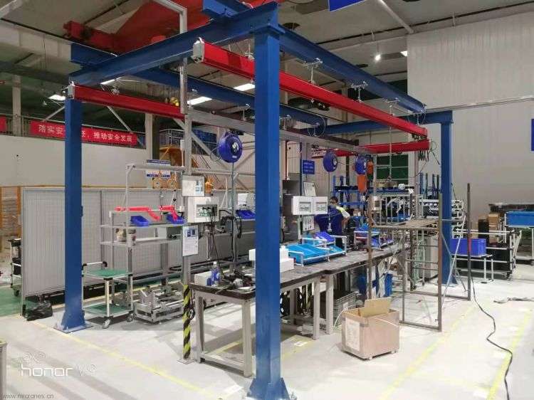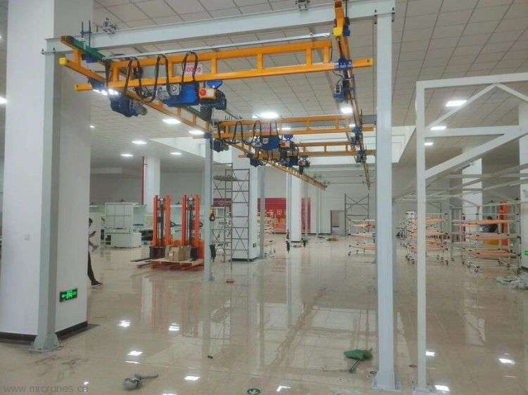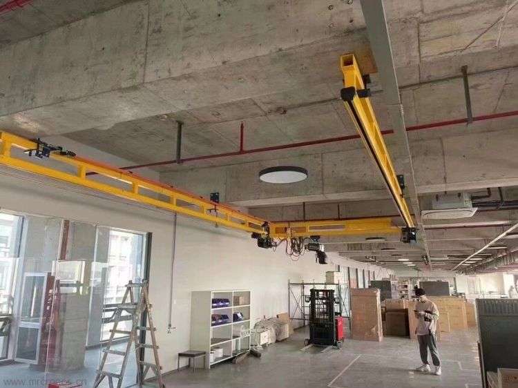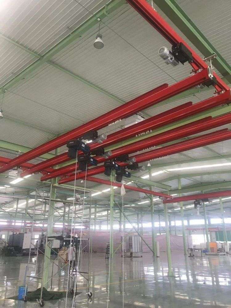 ,也可吊挂一些机械手或焊枪之类,作为工具滑轨使用,起重量一般不过2000k0.只需简单地悬挂在厂房顶板或梁架上,或者立柱于地面15厘米的水泥地面上,便可实现物料的空中直接输送,因此被广泛地应用于各行各业的物料输送环节或系统